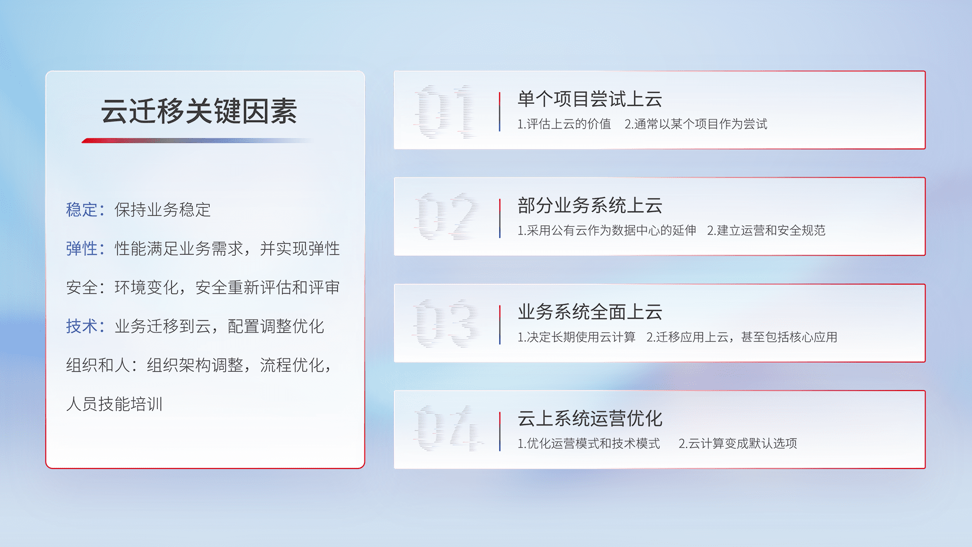 结合实际业务,,,从规划设计、、、、云平台选型、、、、云原生改造、、、数据迁移、、集成交付,,迁移全过程为客户识别最佳上云路径,,,,做好风险识别管理,,,设计网络架构、、身份权限、、、、安全审计合规、、、、操作审计、、、、日志审计、、监控告警策略、、、、多站点容灾设计等,,对云上基础设施进行整体规划,,提升IT治理水平,,,以满足弹性、、、高可用、、、高性能的需求。。。。