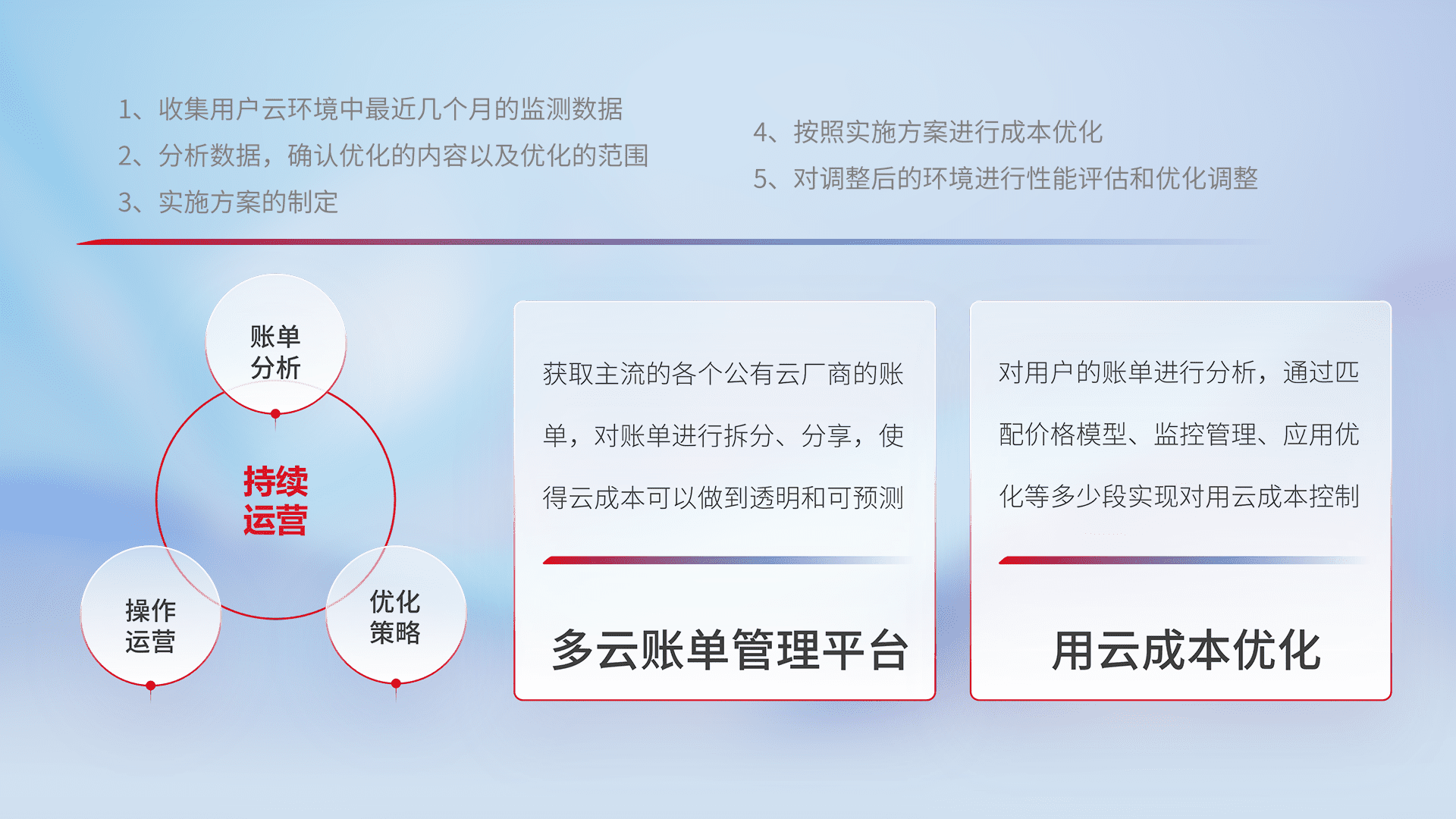 通过多云纳管,,,,以统一的资源数据模型把客户的云资源进行抽象和封装,,,进而实现对多云资源的统一操作,,,保障云资源管理的可靠性、、、、稳定性与可用性。。。量身定制化运维内容,,,,配置、、、开发运维、、补丁管理、、、、备份、、监控、、认证和访问管理、、审计和日常巡检等,,,,保障在用云过程中的可靠度,,,,稳定度以及高可用率。。。